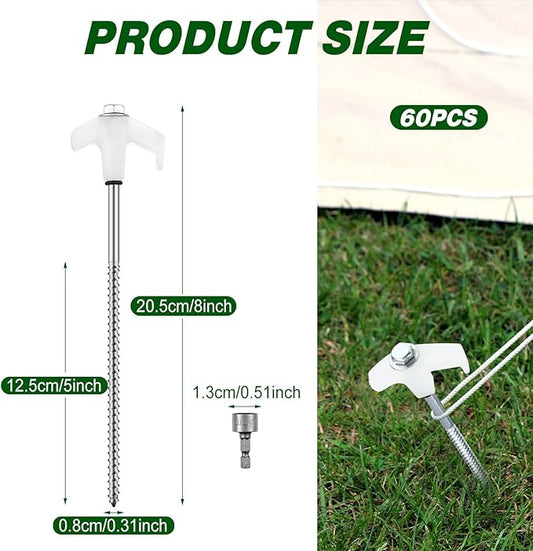 Hicarer 60 Pcs 8'' Screw in Tent Stakes Heavy Duty Ground Anchors Screw in Tent Pegs Ground Stakes Tent Spikes Metal Tent Spikes with Hex Head Driver for Camping Garden Canopies (Luminous White)