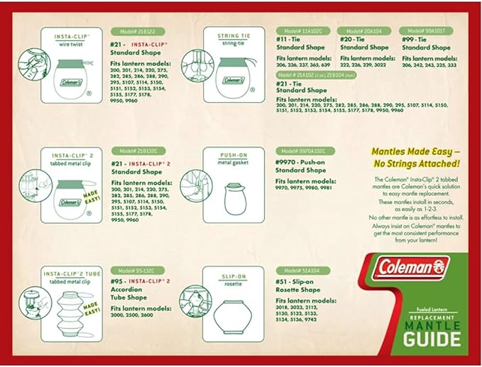 - For use with any Coleman Lantern , designed to fit Insta-Clip 21 Mantles