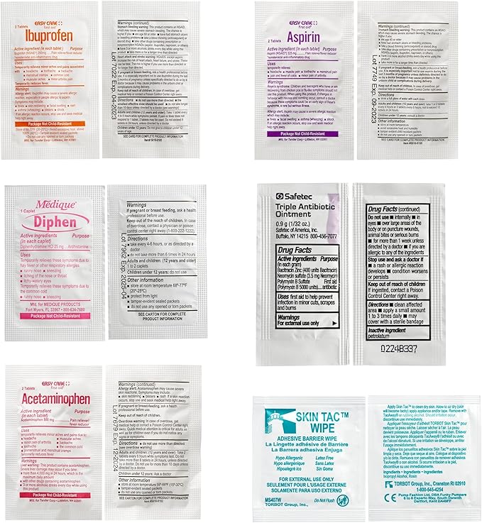 - Contents: Includes a variety of bandages, insect sting relief, antiseptic wipes, antibiotic ointment, medication moleskin, alcohol swabs, a splinter picker and a safety pin