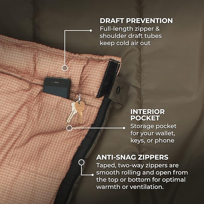 - STAY WARM: Rain or shine, you'll be warm and rested in this sleeping bag. Innovative fiber fill; double-layer construction and draft tubes work together to keep the cold out and the warmth in. Stay cozy on all your outdoor adventures