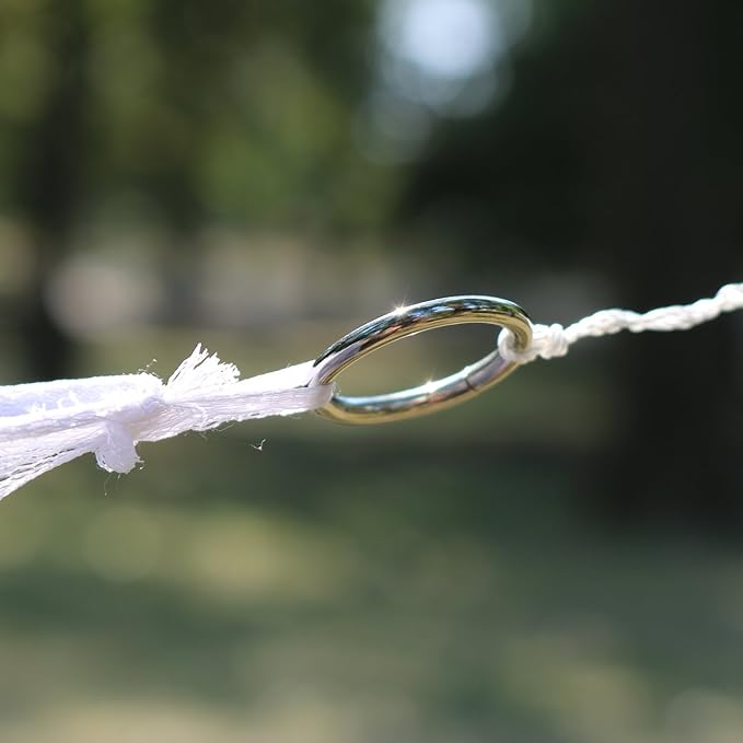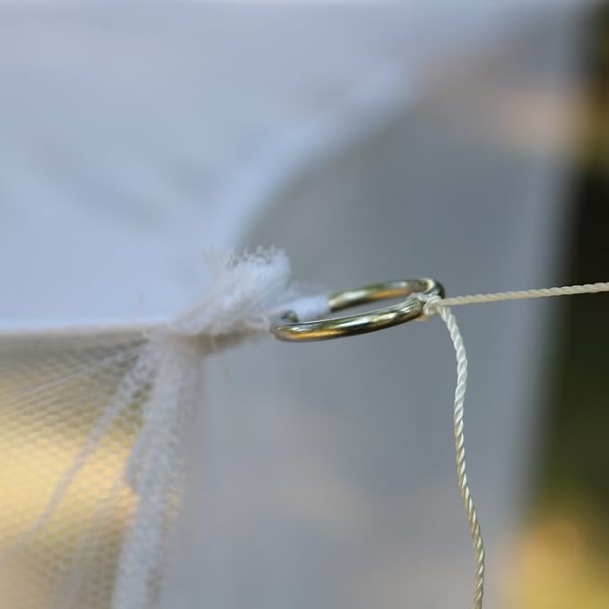 - Six reinforced metal tie tabs at corners and sides; anchor four corners into ground, hang top two corners from tree or posts.