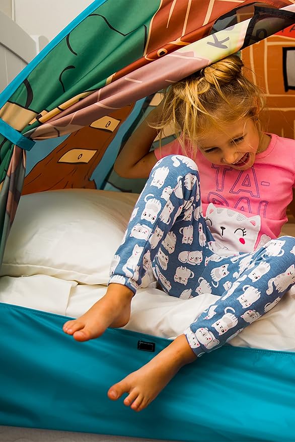 - Twin bed tent size: 77" X 38" X 35" high, Fun tree house graphics, Can be used on or off the bed