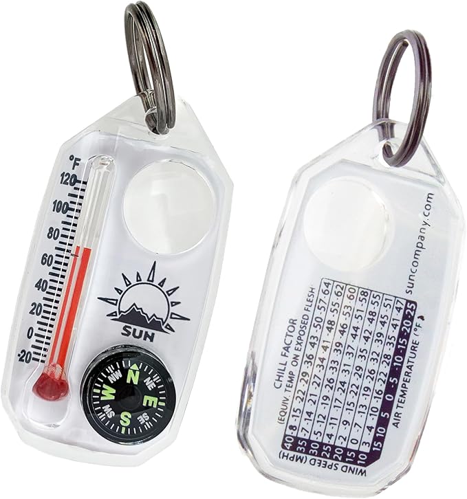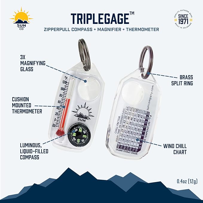 Sun Company TripleGage - 3-in-1 Zipper Pull with Compass, Thermometer, and Magnifying Glass | Essential Outdoor Navigation Tool for Camping, Hiking, and Scouting