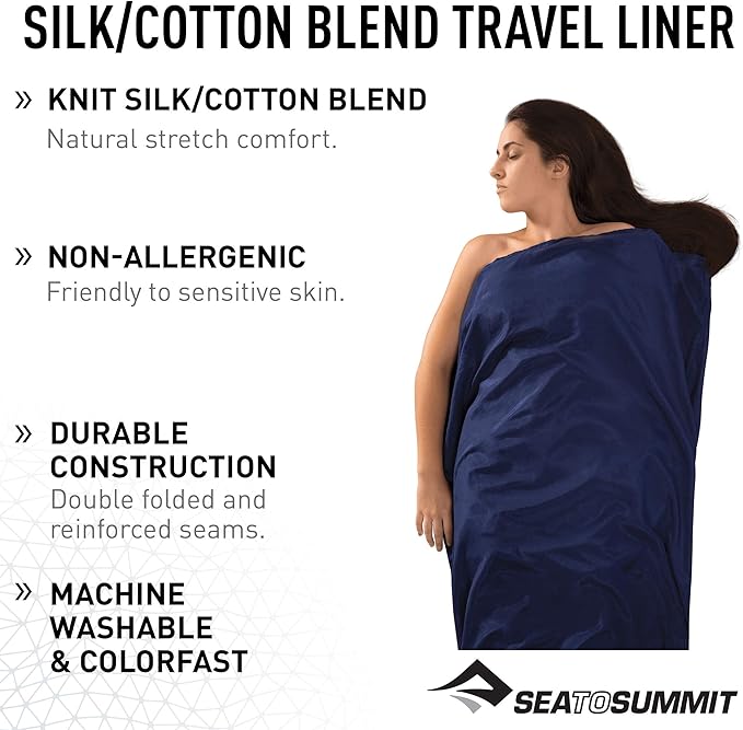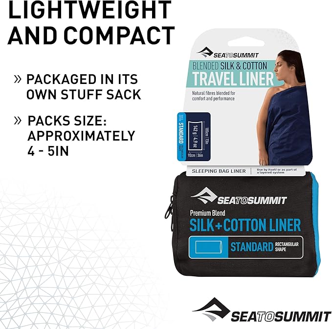 - Lightweight and compact silk-cotton blend sleeping bag liner for backpacking, camping, and travel