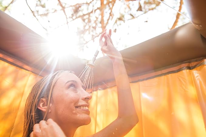 - Shower enclosure; designed to be used outdoors with a camping shower