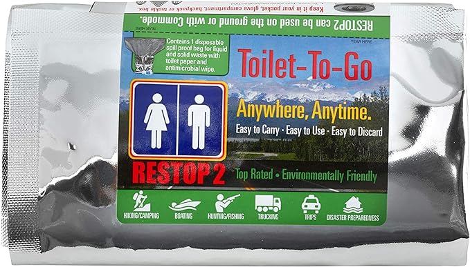 - CONVENIENT ANYWHERE: The RESTOP 2 is ideal for “pack it in, pack it out” designated areas. The user-friendly drawstring inner waste bag easily folds into the outer bag and can then be discarded into any trash receptacle. Great to use as a portable toilet on road-trips, in marathons, on fishing trips, while camping, at concerts (skip the portapotty), or when you’re on a hike. Use with or without a portable commode, travel toilet, or camping toilet.