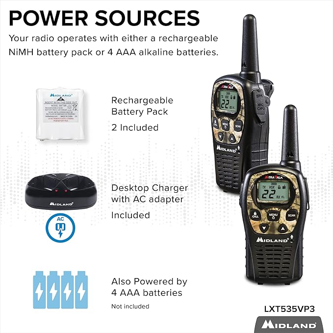 - DUAL POWER OPTIONS - To power your radio use the Ni-MH rechargeable battery pack or 4 “AAA” Alkaline batteries each (Not Included)