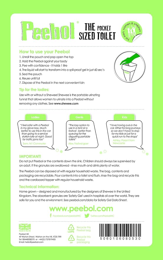 - ⏱️ RAPID ⏱️ – Turns urine into a solid gel in under 60 seconds. When you need to pee, simply unroll the Peebol bag, pop open the top gripper, and wee. The Peebol is made in the UK, and sold to the world.