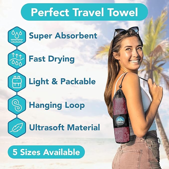 - SUPER ABSORBENT and FAST DRYING MICROFIBER: Our quick dry travel towel can hold up to five times its weight in water, making it the most functional microfiber towel for travel packing. Our microfiber towels also dry up to ten times faster than normal, terry cloth or cotton towels. They’re perfect for indoor or outdoor activities.