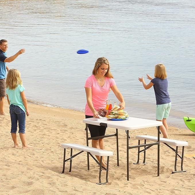 LIFETIME 80373 Portable Folding Camping RV Picnic Table and Bench Set, Almond