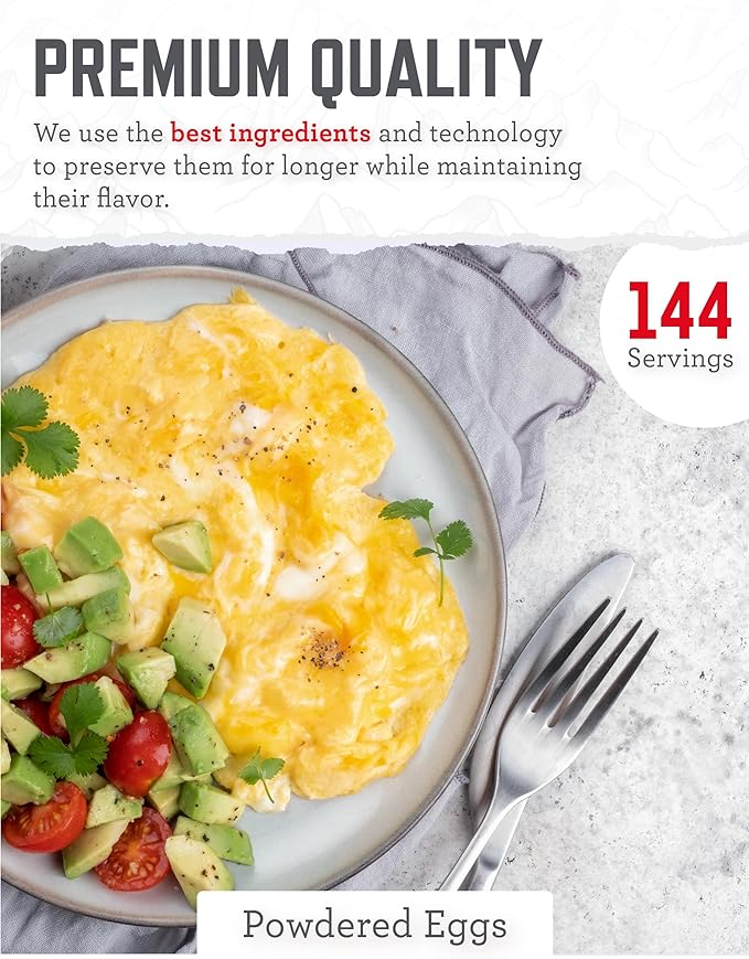 - POWDERED EGGS PERFECTION: Our emergency-food survival kit is your lifeline, complete with premium powdered freeze-dried eggs. These eggs are a valuable addition to your dehydrated-food supply, offering genuine flavor and nutritional excellence.