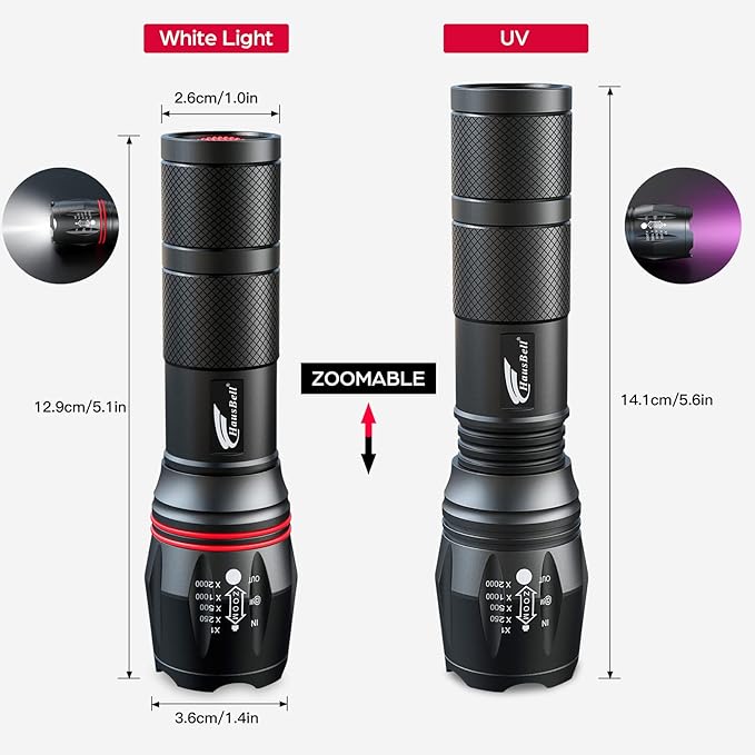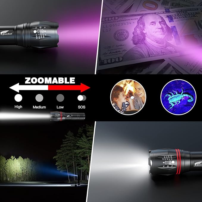 HAUSBELL 365 nm UV Flashlight Black Light Flash Light, Zoomable Blacklight Flashlights with Five Modes for Dog Cat Urine Detection and Emergencies, UV 2 Pack
