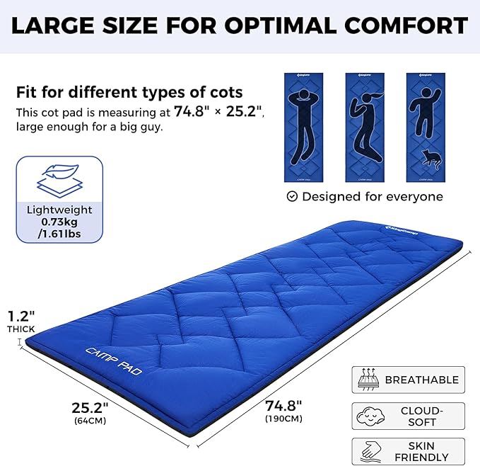 - VERSATILE AND CONVENIENT - Our camping cot pad is not only a cot pad and you can use it as a sleeping pad on the floor or on the lawn. The cot sleeping pad is machine washable.