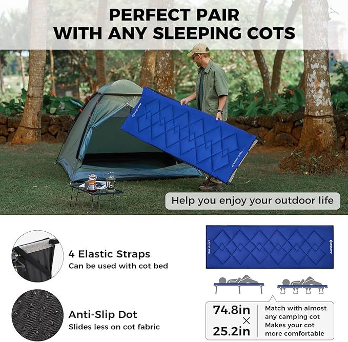 - GENEROUS SIZE - Our cot pad measures 74.8 × 25.2 inches - perfect for big guys. Equipped with 4 elastic straps, it stays firmly in place on your cot, delivering a snuggly fit.