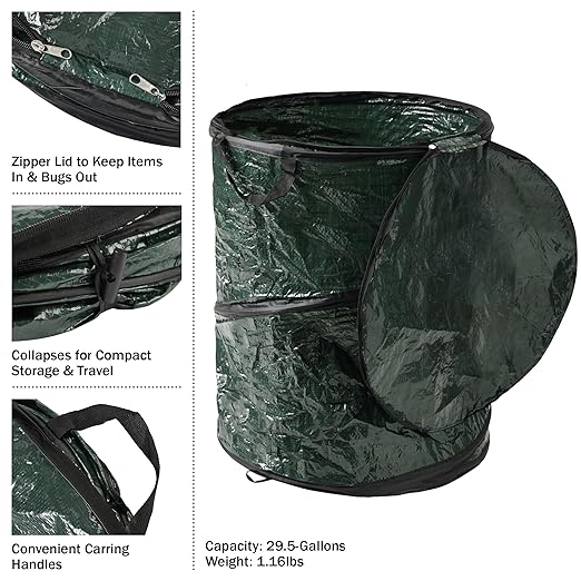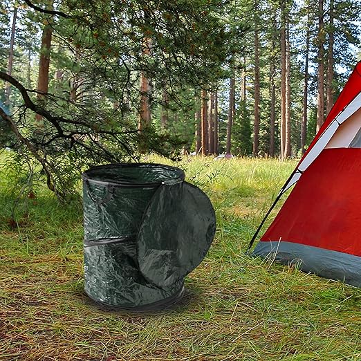 - POP UP TRASH CAN - This camping trash can is great for yard work, collecting empty bottles after parties, and keeping your campsite clean, or you can even use it as a laundry basket. With a 29.5-gallon capacity, the possibilities are endless.