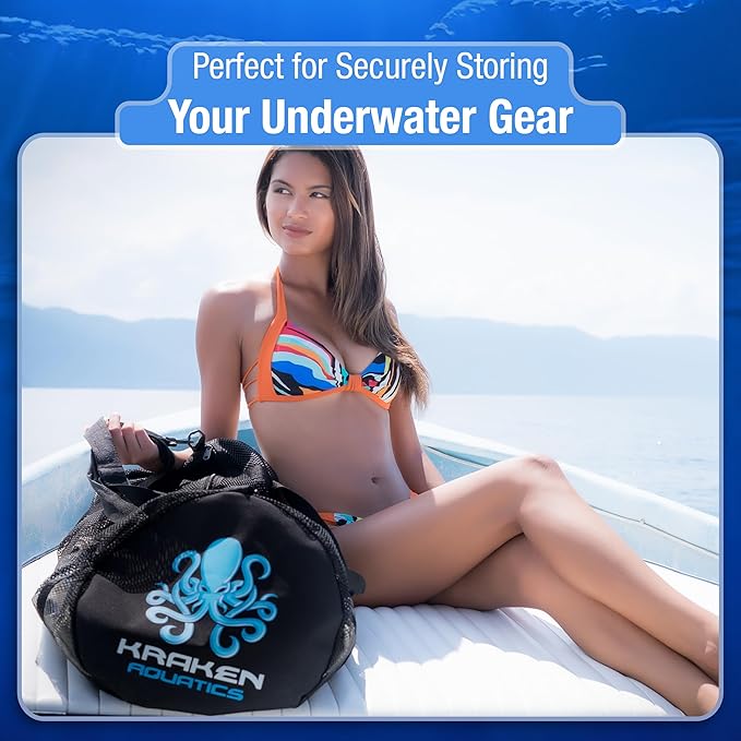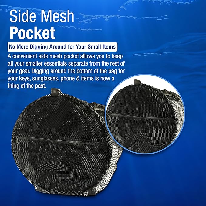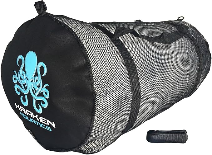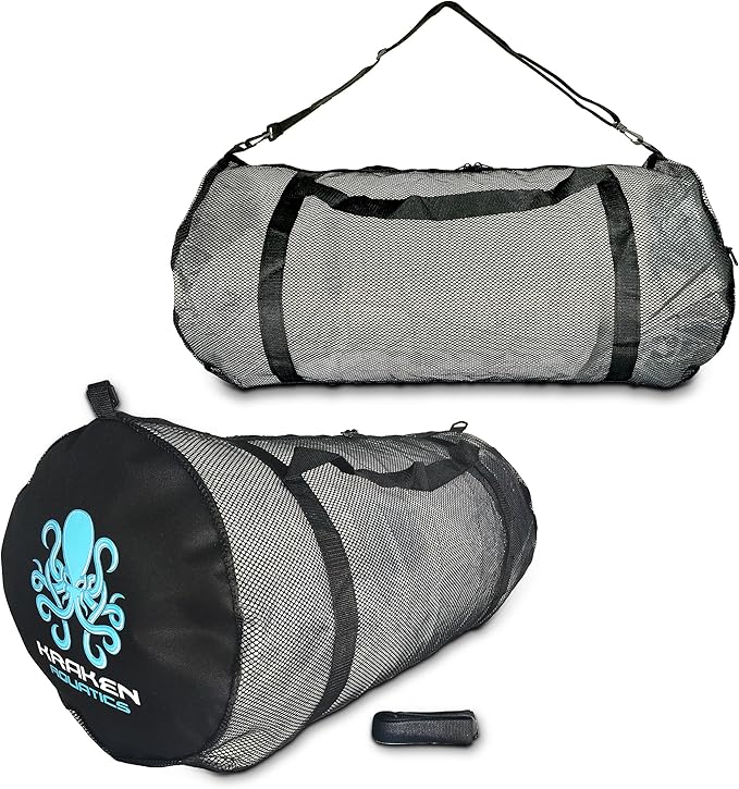 - Spacious Dive Bag for All Your Gear: Our extra-large mesh duffle bag is designed to hold all your scuba gear, snorkeling equipment, freediving gear, spearfishing gear, swimming gear, and more. Perfect for divers, beachgoers, and adventurers, this heavy-duty dive bag offers ample storage for wetsuits, fins, masks, towels, and other essentials. Its breathable mesh construction ensures airflow to help keep your equipment fresh and ready for your next trip.