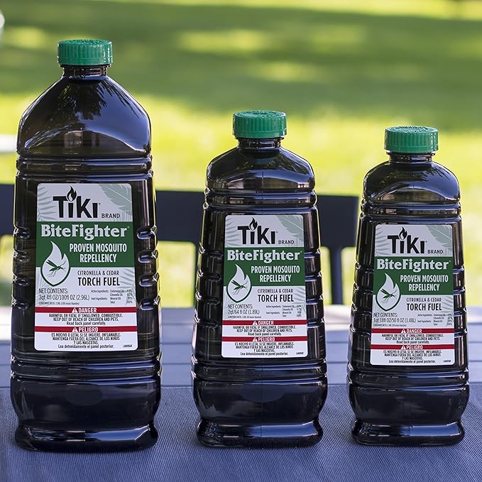 - Mosquito repellent torch fuel: keep away uninvited guests who buzz and bite! The citronella & cedar formula provides proven mosquito repellency & works with all tiki brand torches & table torches
