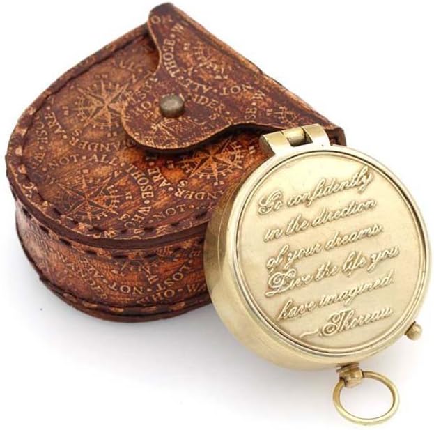 - Personalized Gift Compass: Brass Engraved Compass with Stamped Leather case. Brass Compass "GO CONFIDENTLY IN THE DIRECTION OF YOUR DREAMS LIVE THE LIFE YOU HAVE IMAGINED". Under the glass cover is beautiful, the high-quality jewelled compass needle settles to the North very quickly for timely and accurate readings. It has a small lever on the side of the compass that operates a needle lift mechanism to protect the compass bearing. Gift for someone you love. Engraved message of the Compass.