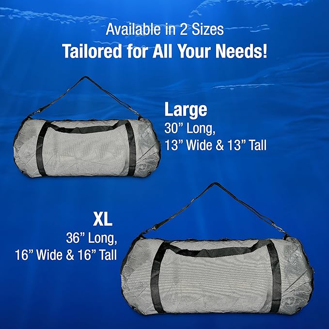 - Spacious Dive Bag for All Your Gear: Our extra-large mesh duffle bag is designed to hold all your scuba gear, snorkeling equipment, freediving gear, spearfishing gear, swimming gear, and more. Perfect for divers, beachgoers, and adventurers, this heavy-duty dive bag offers ample storage for wetsuits, fins, masks, towels, and other essentials. Its breathable mesh construction ensures airflow to help keep your equipment fresh and ready for your next trip.