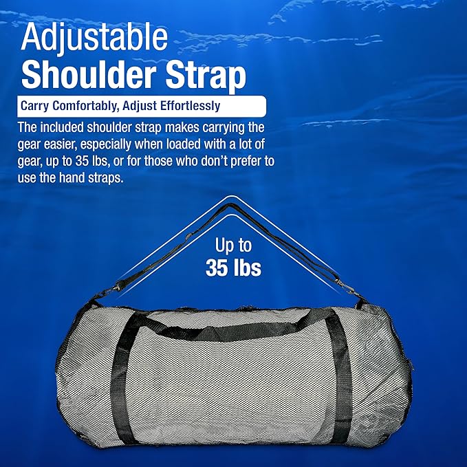 - Comfortable & Adjustable Carrying: This scuba diving bag features an adjustable padded shoulder strap and reinforced carry handles for multiple carrying options. The durable construction supports up to 35 lbs of gear without strain, making it ideal for heavy loads. Whether you're hauling your snorkeling gear for adults, freediving gear, or beach essentials, this bag ensures effortless carrying, reducing strain on your shoulders and hands.
