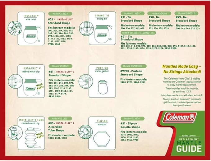 - Burn your Coleman lantern and get the best possible light with the Instaclip Wire #21 Mantle. The mantles are designed to fit into place on the burners; just pinch the wires together to attach. They are specially designed to provide clear bright light.
