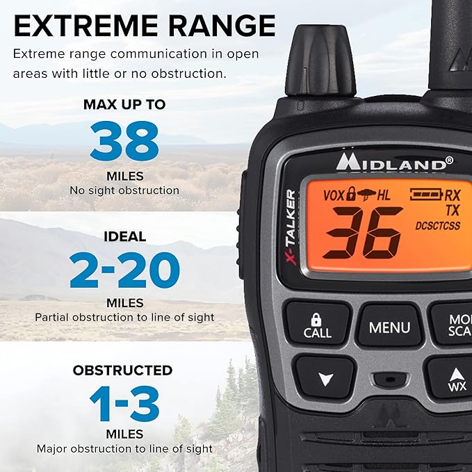- Xtreme Range: Longer-range communication in open areas with little or no obstruction. Midland, a trusted name in two-way radios, these walkie-talkies are engineered for durability and reliability, ready to withstand your wildest outdoor escapades. Enjoy long-range communication, allowing you to stay connected over extended distances and explore without limits. These walkie-talkies work seamlessly with FRS radios, enabling communication with your friends, RV Buddies, or Caravanning adventurers.