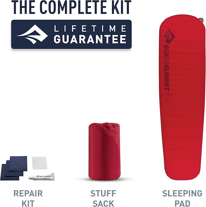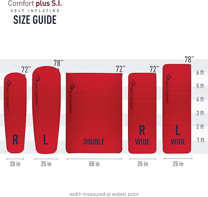 - Tapered - Large size measures 78 x 25 x 3 inches, packs to 7 x 13.5 inches, weighs 2.9 pounds; includes stuff sack, field repair kit, and PillowLock patches for securing a Sea to Summit pillow to mat