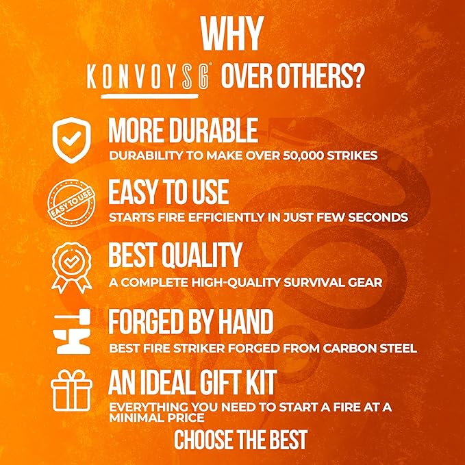 - Flint & Steel Legacy: Ignite the wilderness with KonvoySG's hand-forged carbon steel striker and English flint stone, mastering traditional firecraft like a pro.