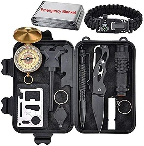 - ➤【ALL IN ONE SURVIVAL KIT FOR EXTREME ADVENTURES】This all in one survival kit contains everything that any survivalist or outdoor enthusiast would need. Includes emergency blanket, fire starter, scraper, compass, swiss card, flashlight, whistle, Survival Bracelet and black box etc