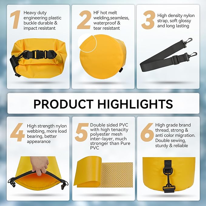 • Floatable and Trackable: The dry sack can float on water without sinking after being rolled up and buckled, so you can quickly track and retrieve your stuff. The D-ring and strap on the bag make it easy to attach to the boat, keeping your stuff always with you without getting lost, allowing you to enjoy thrilling outdoor activities with peace of mind.