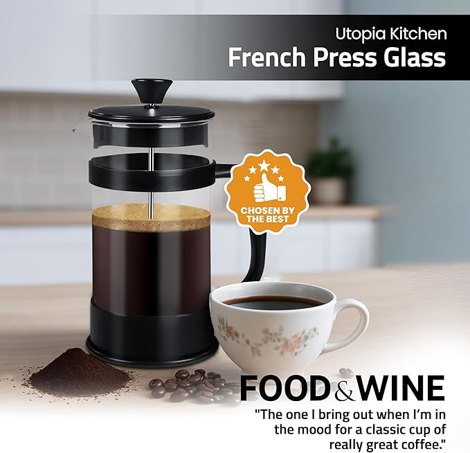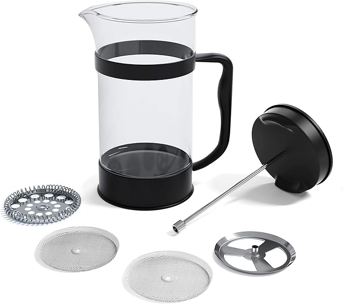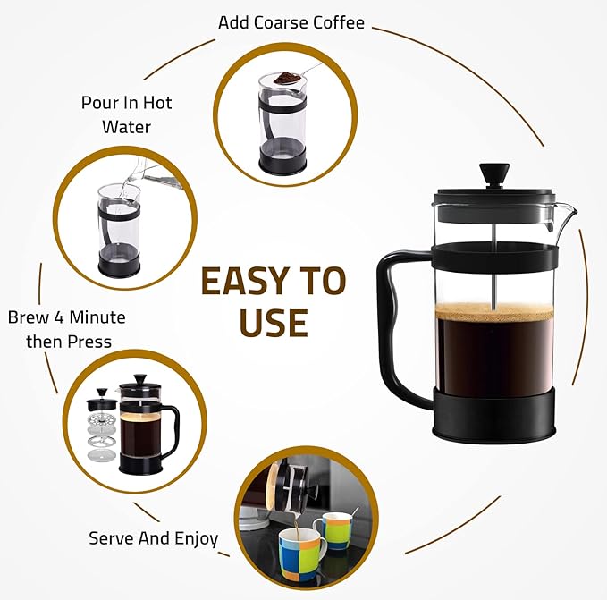 - Easy to Use: The French press comes with a coffee spoon and is convenient for quick coffee making. Brew homemade coffee in just four easy steps; add coarse ground coffee, add hot water and stir, wait a few minutes, and press to enjoy a refined flavored cup of coffee.
