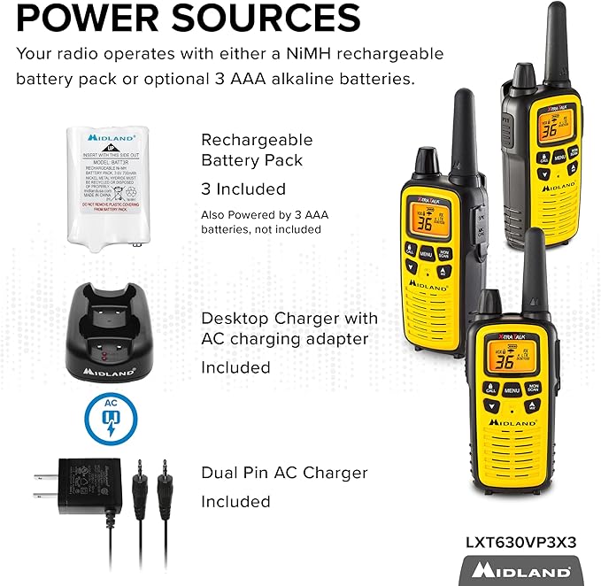 - LICENSE FREE DUAL POWER OPTIONS 2-WAY RADIOS - These walkie-talkies feature 36 FRS (Family Radio Service) channels, along with channel scan to check for activity. The bold yellow faceplate provides high visibility. Dual Power Options uses rechargeable battery pack (included) or 3 “AAA” batteries (not included)