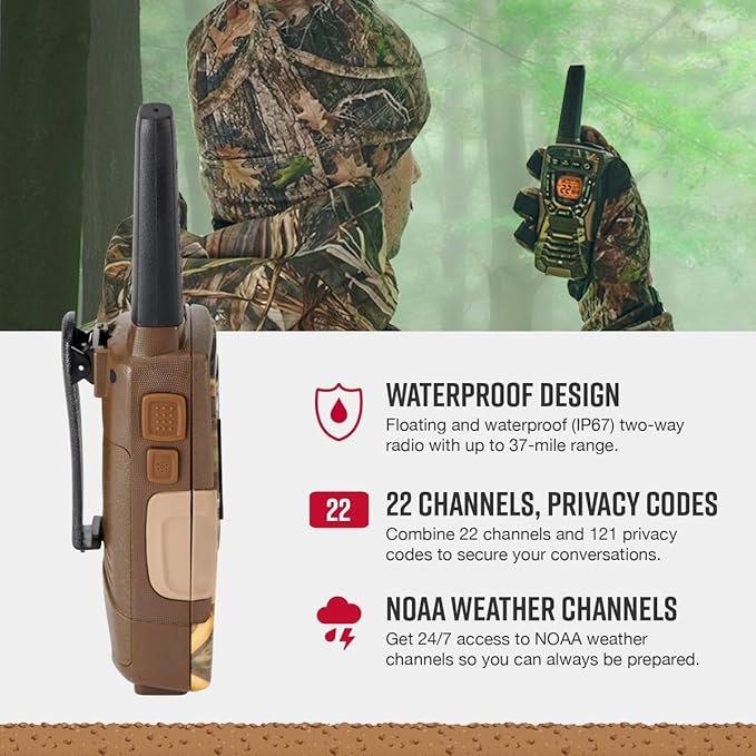 - 22 Channels and 121 Privacy Codes – These easy-to-use walkie talkies combine 22 channels and 121 privacy codes to secure your conversations from surrounding hikers, hunters or wherever your adventure takes you