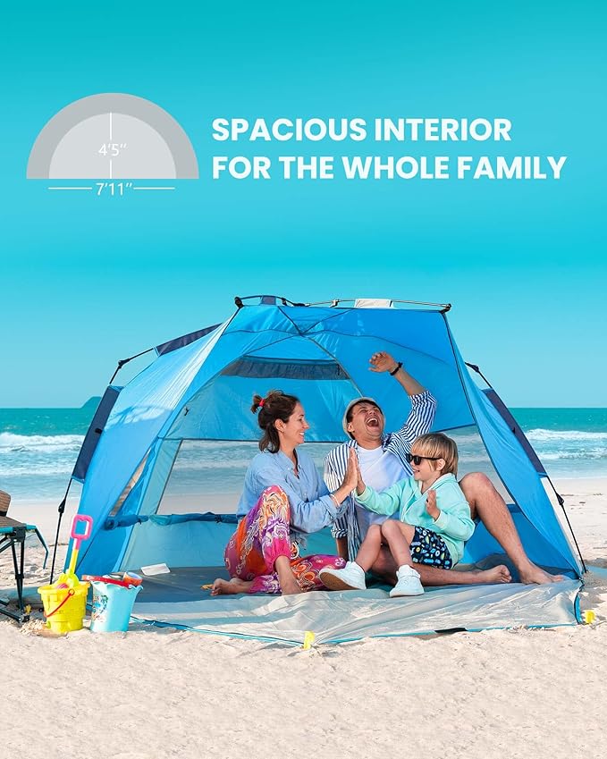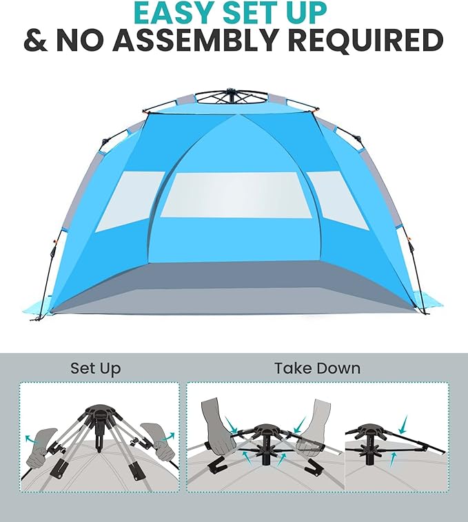 - Easy Set Up and Portable: This pop up beach tent allows to set up in seconds, without complicated installation steps. Frustrated days of putting up and taking down large beach tents has gone! Lightweight and easy to fold back with a compact carrying bag for easy transport and storage