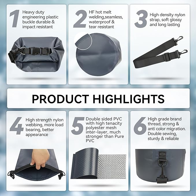 • Floatable and Trackable: The dry sack can float on water without sinking after being rolled up and buckled, so you can quickly track and retrieve your stuff. The D-ring and strap on the bag make it easy to attach to the boat, keeping your stuff always with you without getting lost, allowing you to enjoy thrilling outdoor activities with peace of mind.