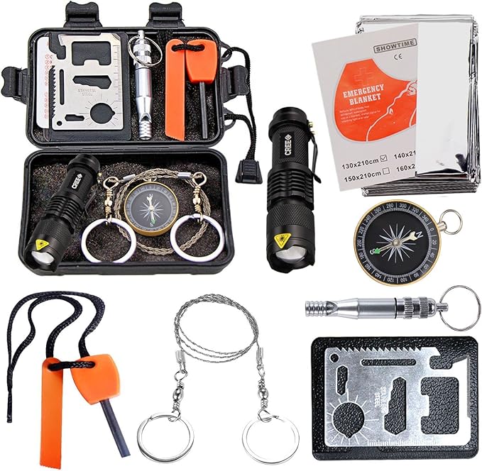 - [Practical & Sturdy Survival Kit]: Whistle is loud and has a key ring on one end. Compass is compact, flexible and high sensitivity. Wire saw has saw blades sharp and smooth, do not hurt hand and can cut stuff and pretty quickly. Fire starter is easy to use, simply draw the strike rod down the block to create sparks to light your kindling.