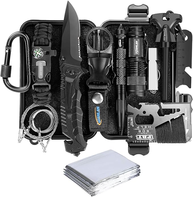 - ➤【ALL IN ONE SURVIVAL KIT FOR EXTREME ADVENTURES】This all in one survival kit contains everything that any survivalist or outdoor enthusiast would need. Includes emergency blanket, fire starter, scraper, compass, swiss card, flashlight, whistle, Survival Bracelet and black box etc