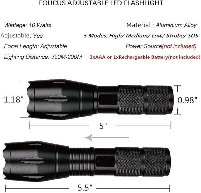 - Adjustable Focus - Adjustable focus for use in different situations (just rotate the flashlight head to adjust). The LED flashlight allows you to select focus between spot and flood beams.