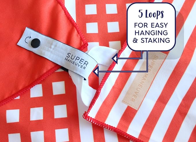 - ATTACHES TO ANYTHING! Five loops enable easy attaching to sun beds, hanging for supercharged dry times, or staking down into the sand on windy days (stakes not included).