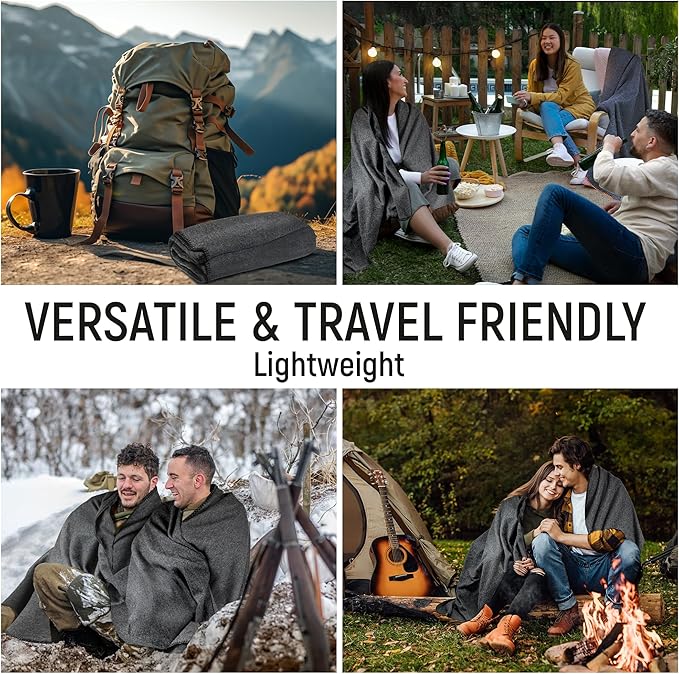 - 🛖【MULTI-USE WOOL BLANKET - HOME TO CAMPSITE】 This versatile Wool Blanket serves multiple purposes: Car Blanket, Picnic Blanket, fire pit companion, indoor fireplace comfort, and Camping Blanket. Perfect for cozy nights at home or outdoor adventures, it offers comfort and warmth while meeting military-grade durability standards.