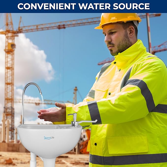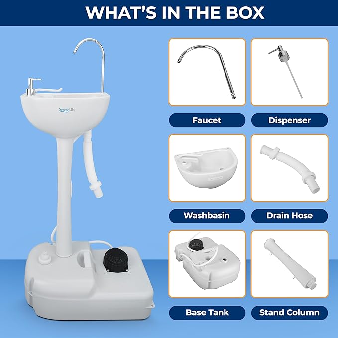 - OUTDOOR CONVENIENCE: The SereneLife Portable Camping Sink makes water easily accessible outdoors Wash your hands or food Features a hands-free operation by just stepping on the foot pump to provide a stream of water