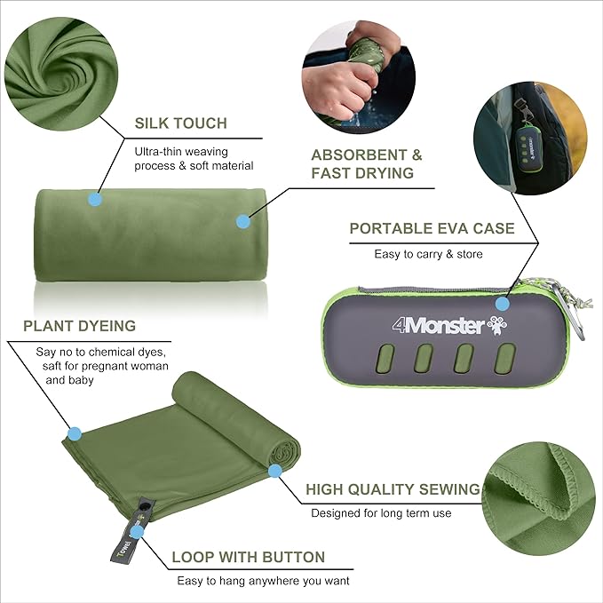 4Monster Camping Towel Super Absorbent-Quick Dry Microfiber Towel Ultra Compact & Soft-Travel Towel Lightweight for Backpacking,Hiking,Gym,Beach,Swimming,Yoga