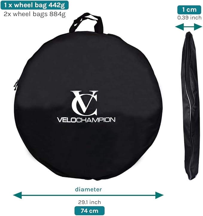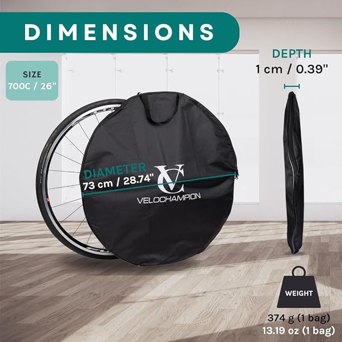 - ✅ 28.74" Road Bike Wheel Bag – This bag measures 28.74" x 28.74" x 0.39" (73 cm x 73 cm x 1 cm) and weighs 13.2 oz (374 grams). It is suitable for 650b and 700c road, gravel, or hybrid wheels, and can also accommodate mountain bike wheels up to 26".