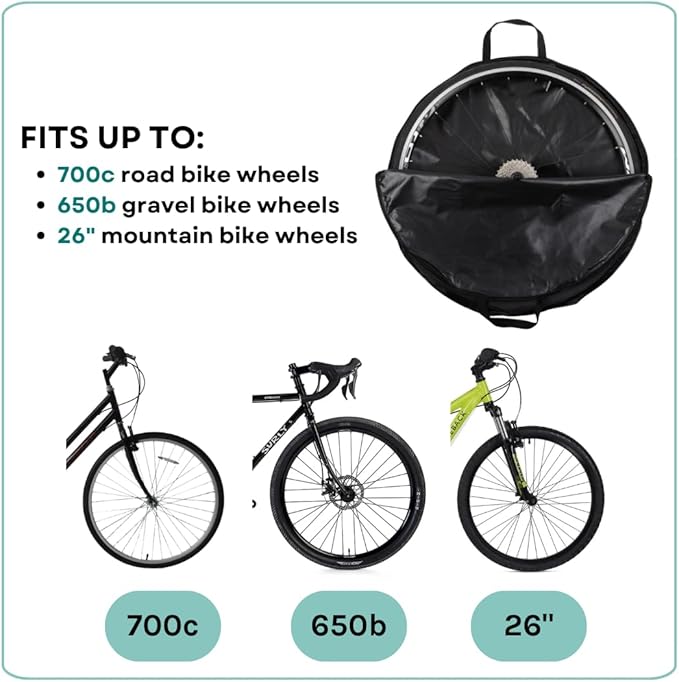 - ✅ PROTECTIVE BIKE WHEEL STORAGE – Our bike carrier bag provides reliable protection for both front wheels and rear wheels with a cassette. Whether you're carrying a spare wheel on race day or storing it at home, this bag safeguards your wheels from scratches, dirt, and grease.