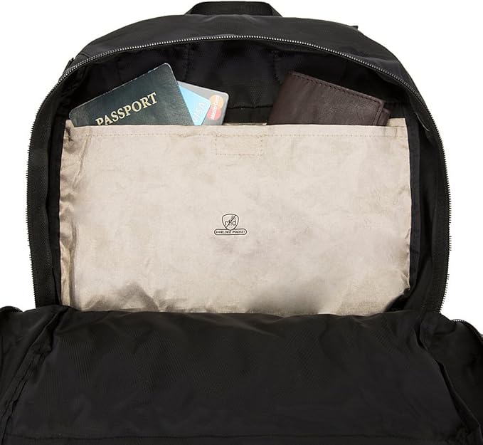 • Locking main compartment with RFID blocking interior pocket, padded straps are secured at back panel.