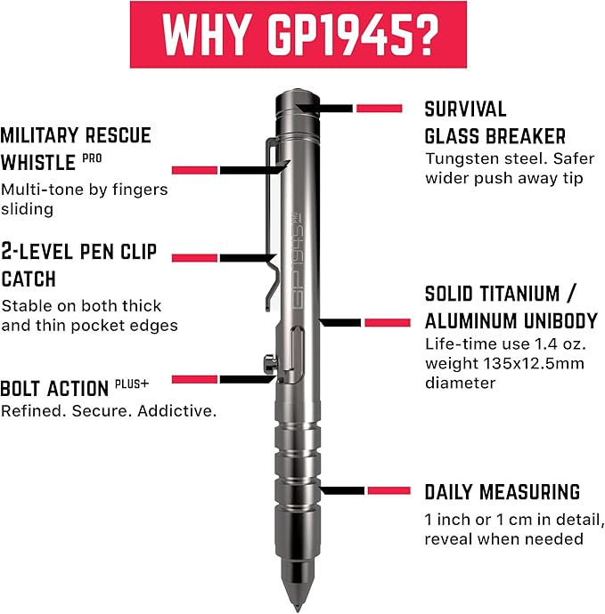 GPCA - GP 1945 Bolt Action Pen PRO, Smart Alternative to a Pen Light, EDC Pen Multitool with Rescue Whistle, Measurement on grip, Survival Gear for Camping, Titanium, Polished
