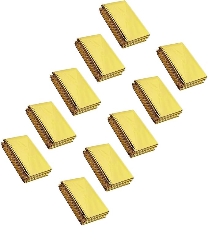 - [PREMIUM MYLAR EMERGENCY BLANKETS]- Durable and advanced aluminized dual-sided Mylar blankets are perfect for conserving body heat in emergency survival situations. The gold is especially designed, with outward gold side to absorb maximum heat and inward silver side to reflect body heat. The double mode can retain more body heat.