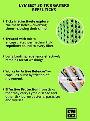 - LYMEEZ STRETCH MESH TICK GAITERS confound and repel ticks. Ticks don’t fly or jump! Most ticks climb on from grass and leaf litter—stop them on their climb. Ticks instinctively explore the variable-sized mesh holes—diverting and slowing them on their climb—exposing them to repellent for longer. Use in conjunction with other repellents on other body areas.