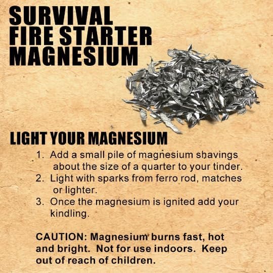 - (1) Bag of Magnesium 3" x 2 1/2" ignites with sparks from your Ferro Rod, hot burning, ignites wet tinder. (1) Bag of Fatwood Dust 2 1/2"x 3", ignites with your Ferro or matches long burning. Fatwood sticks use for tinder.