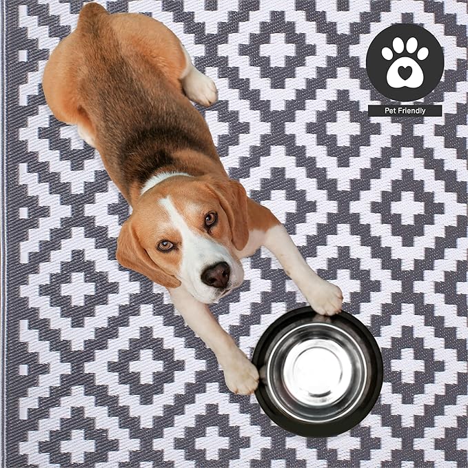 FH Home Outdoor Rug - Waterproof, Fade Resistant, Reversible - Premium Recycled Plastic - Geometric - Patio, Deck, Porch, Balcony, Laundry Room - Aztec - Gray & White Crease Free - 4 x 6 ft